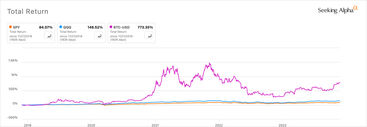 Investors who love SPY and QQQ might also consider Bitcoin as a long-term investment for several reasons. First, as shown below, Bitcoin has historically outperformed these assets over the years. As shown below, Bitcoin is up by 773% in the past five years. It has done much better since 2009.